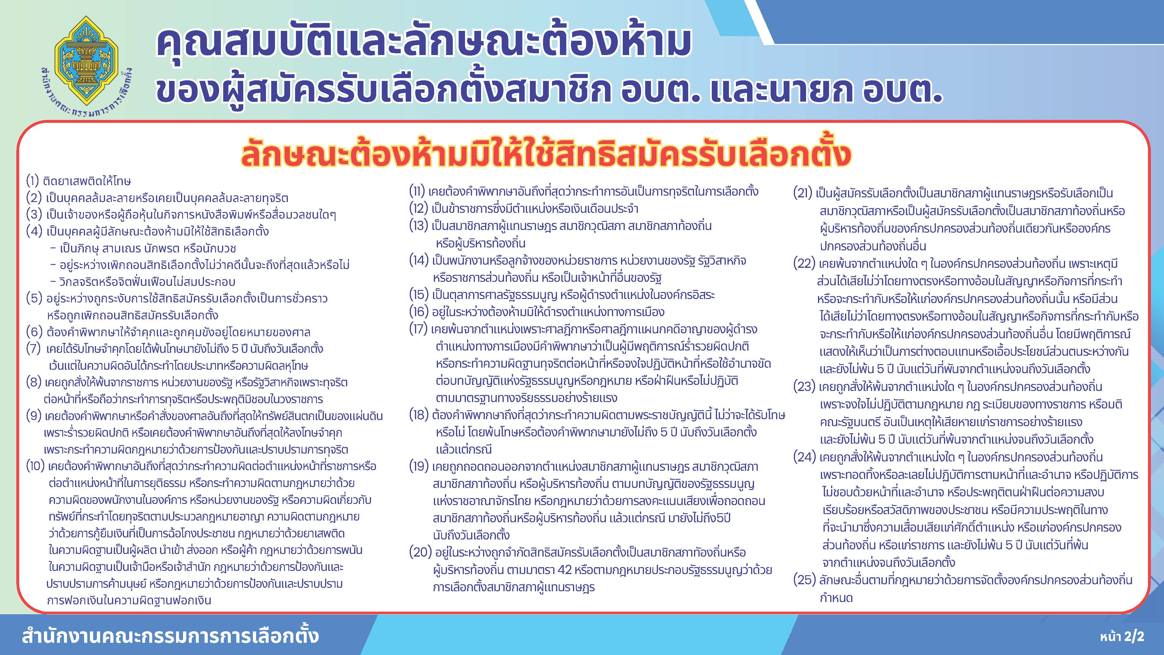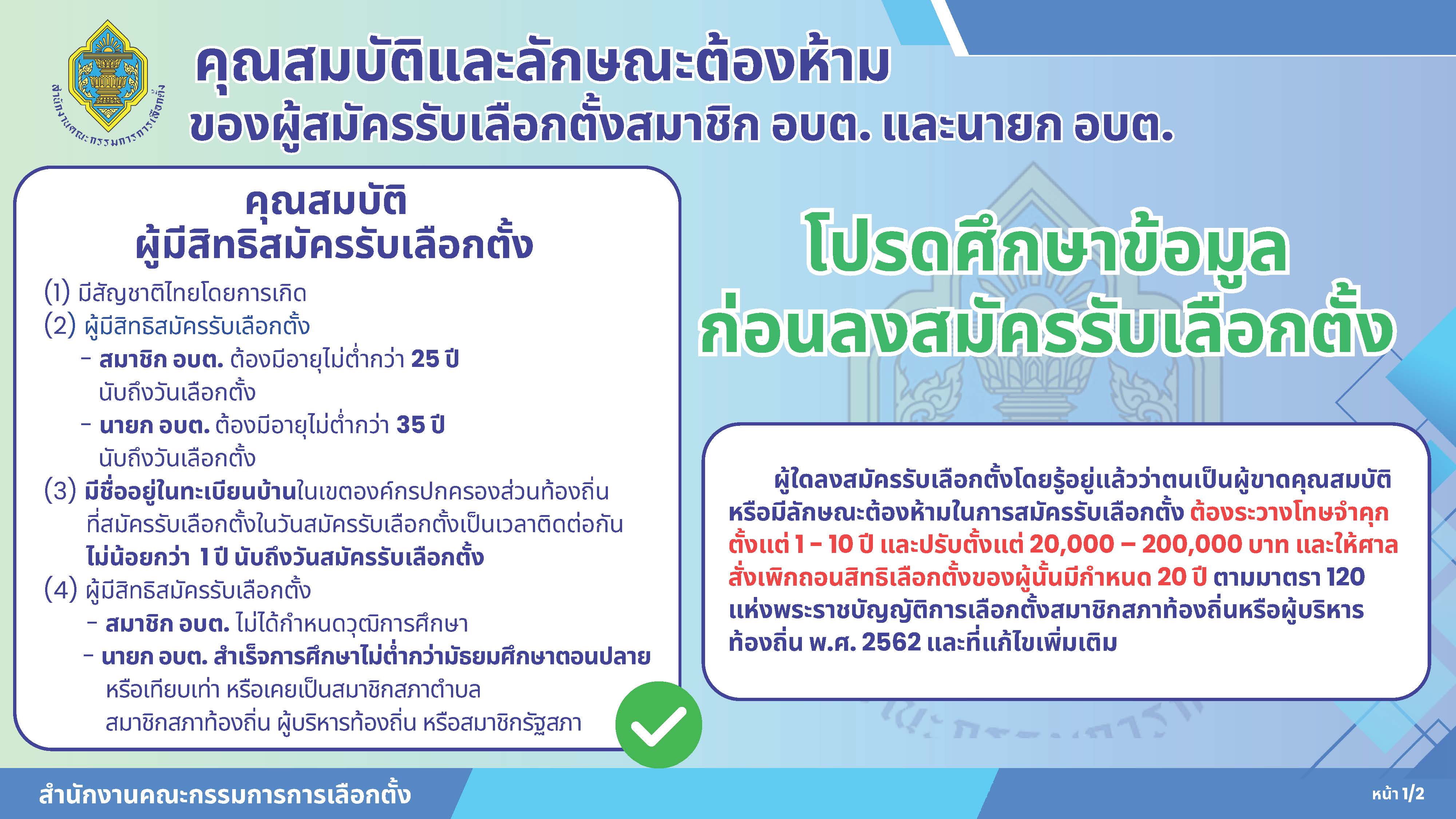ประชาสัมพันธ์คุณสมบัติและลักษณะต้องห้ามของผู้รับเลือกตั้งสมาชิกสภาองค์การบริหารส่วนตำบลและนายกองค์การบริหารส่วนตำบล |