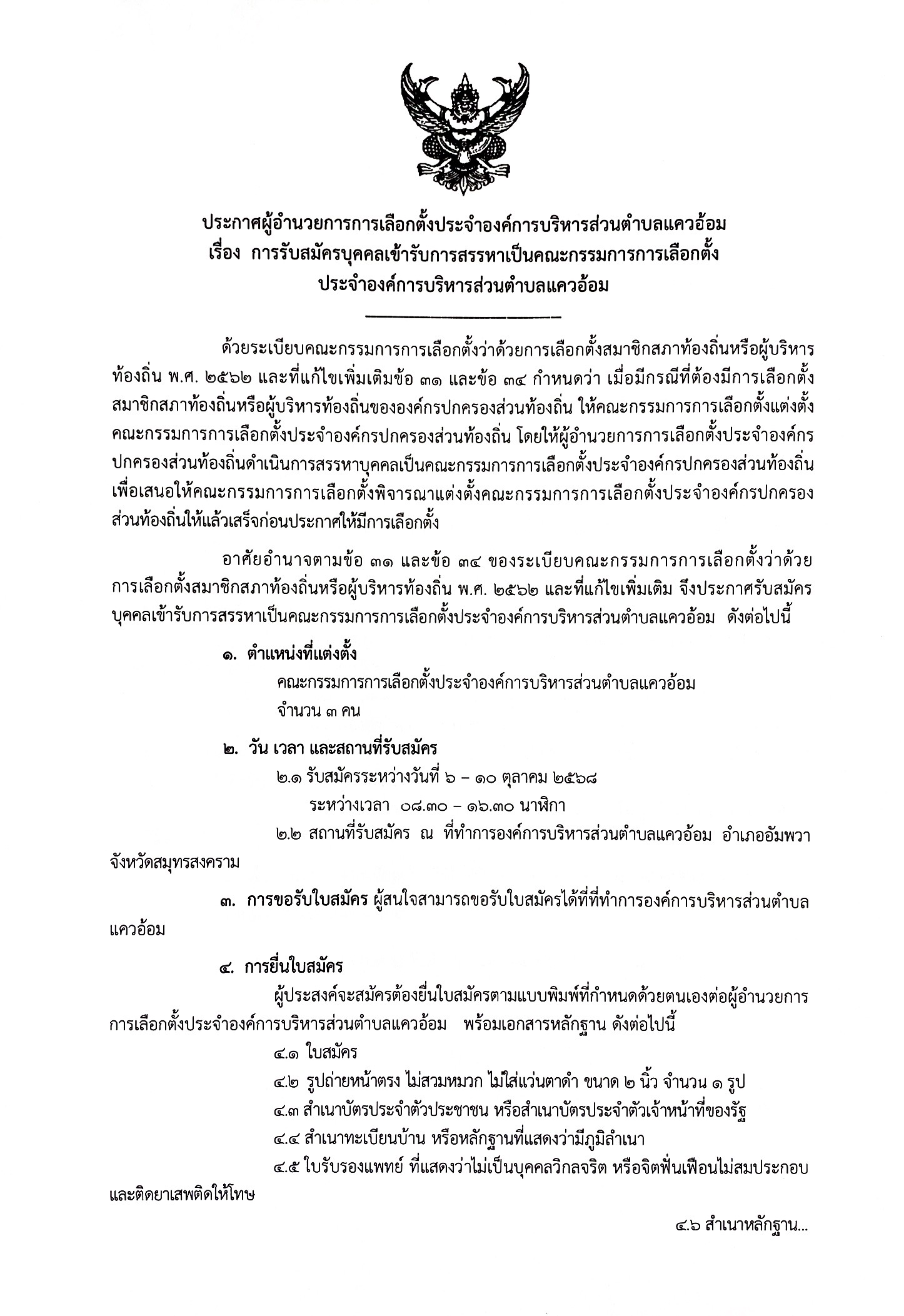 ประกาศการรับสมัครบุคคลเข้ารับการสรรหาเป็นคณะกรรมการการเลือกตั้งประจำองค์การบริหารส่วนตำบลแควอ้อม |